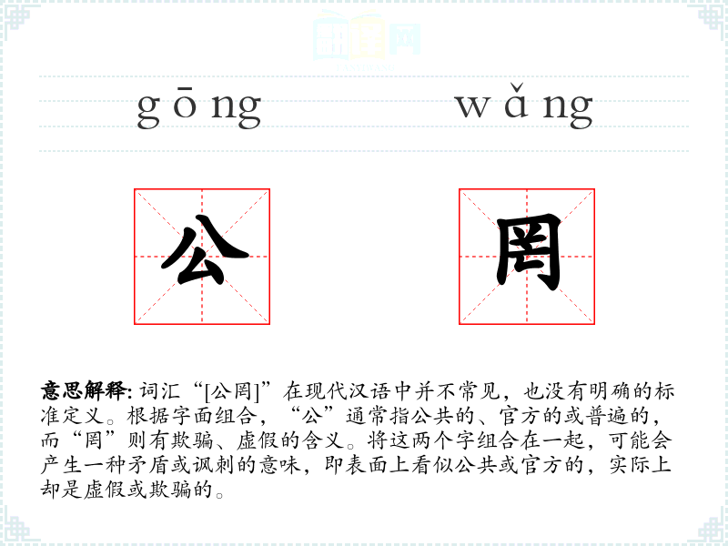 - 词源:“公”和“罔”都是古代汉语中的常用字,组合在一起可能是现代汉语中的一个创造性用法。