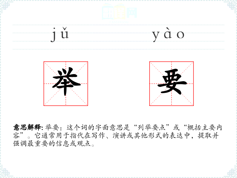 举要:这个词的字面意思是“列举要点”或“概括主要内容”。它通常用于指代在写作、演讲或其他形式的表达中,提取并强调最重要的信息或观点。