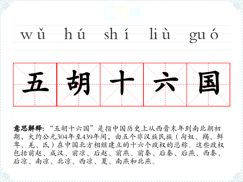 “五胡十六国”是指历史上从西晋末年到南北朝初期,大约公元304年至439年间,由五个非民族(匈奴、羯、鲜卑、羌、氐)在**北方相继建立的十六个政权的总称。这些政权包括前赵、成汉、前凉、后赵、前燕、前秦、后秦、后燕、西秦、后凉、南凉、北凉、西凉、夏、南燕和北燕。