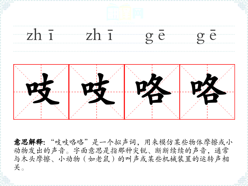 “吱吱咯咯”是一个拟声词,用来模仿某些物体摩擦或小动物发出的声音。字面意思是指那种尖锐、断断续续的声音,通常与木头摩擦、小动物(如老鼠)的叫声或某些机械装置的运转声相关。