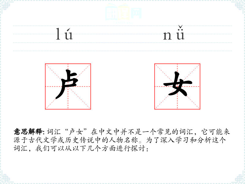 词汇“卢女”在中文中并不是一个常见的词汇,它可能来源于古代文学或历史传说中的人物名称。为了深入学*和分析这个词汇,我们可以从以下几个方面进行探讨: