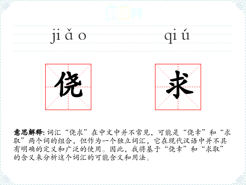 词汇“侥求”在中文中并不常见,可能是“侥幸”和“求取”两个词的组合,但作为一个独立词汇,它在现代汉语中并不具有明确的定义和广泛的使用。因此,我将基于“侥幸”和“求取”的含义来分析这个词汇的可能含义和用法。