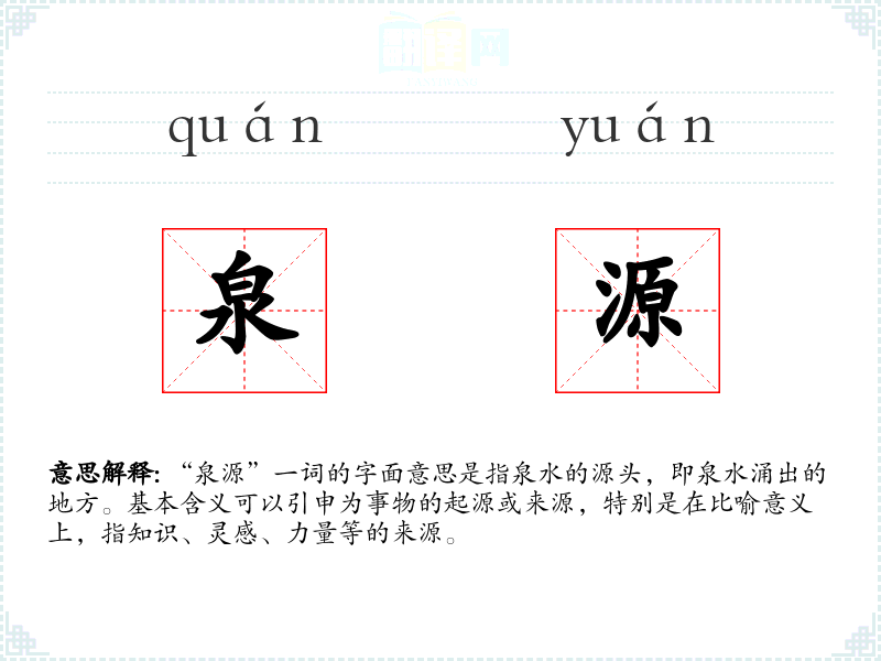 “泉源”一词的字面意思是指泉水的源头,即泉水涌出的地方。基本含义可以引申为事物的起源或来源,特别是在比喻意义上,指知识、灵感、力量等的来源。