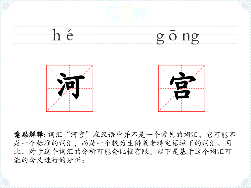 词汇“河宫”在汉语中并不是一个常见的词汇,它可能不是一个标准的词汇,而是一个较为生僻或者特定语境下的词汇。因此,对于这个词汇的分析可能会比较有限。以下是基于这个词汇可能的含义进行的分析: