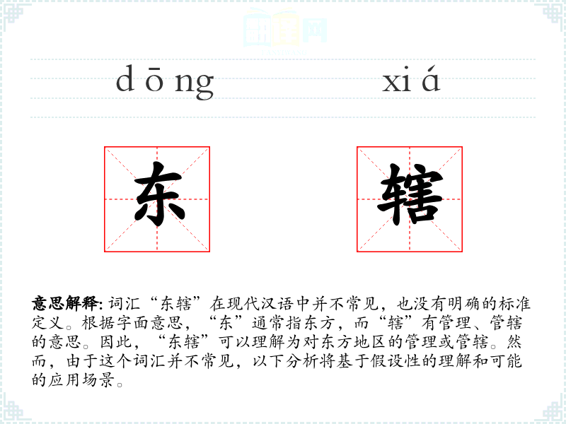 词汇“东辖”在现代汉语中并不常见,也没有明确的标准定义。根据字面意思,“东”通常指东方,而“辖”有管理、管辖的意思。因此,“东辖”可以理解为对东方地区的管理或管辖。然而,由于这个词汇并不常见,以下分析将基于假设性的理解和可能的应用场景。
