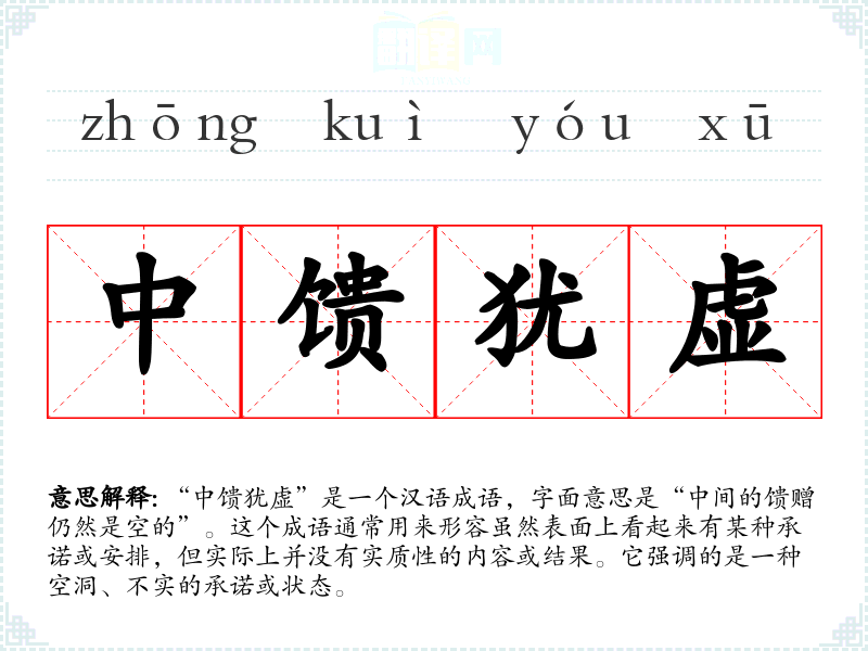 “中馈犹虚”是一个汉语成语,字面意思是“中间的馈赠仍然是空的”。这个成语通常用来形容虽然表面上看起来有某种承诺或安排,但实际上并没有实质性的内容或结果。它强调的是一种空洞、不实的承诺或状态。
