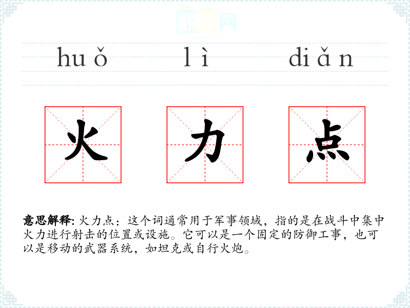 火力点:这个词通常用于军事领域,指的是在战斗中集中火力进行射击的位置或设施。它可以是一个固定的防御工事,也可以是移动的武器系统,如坦克或自行火炮。