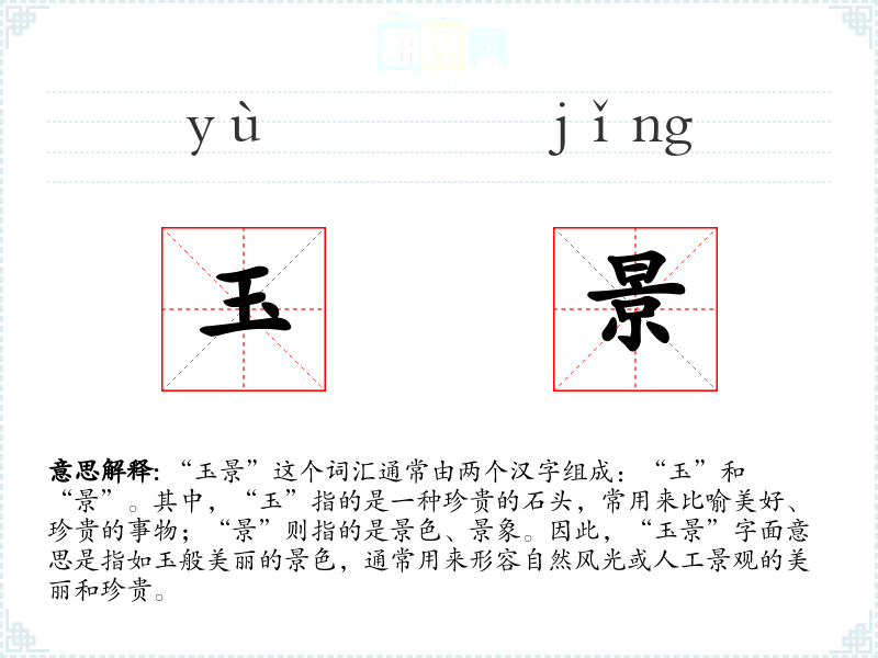 “玉景”这个词汇通常由两个汉字组成:“玉”和“景”。其中,“玉”指的是一种珍贵的石头,常用来比喻美好、珍贵的事物;“景”则指的是景色、景象。因此,“玉景”字面意思是指如玉般美丽的景色,通常用来形容自然风光或人工景观的美丽和珍贵。