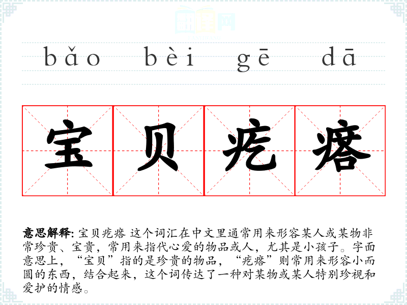 宝贝疙瘩 这个词汇在中文里通常用来形容某人或某物非常珍贵、宝贵,常用来指代心爱的物品或人,尤其是小孩子。字面意思上,“宝贝”指的是珍贵的物品,“疙瘩”则常用来形容小而圆的东西,结合起来,这个词传达了一种对某物或某人特别珍视和爱护的情感。