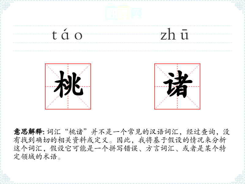 词汇“桃诸”并不是一个常见的汉语词汇,经过查询,没有找到确切的相关资料或定义。因此,我将基于假设的情况来分析这个词汇,假设它可能是一个拼写错误、方言词汇、或者是某个特定领域的术语。