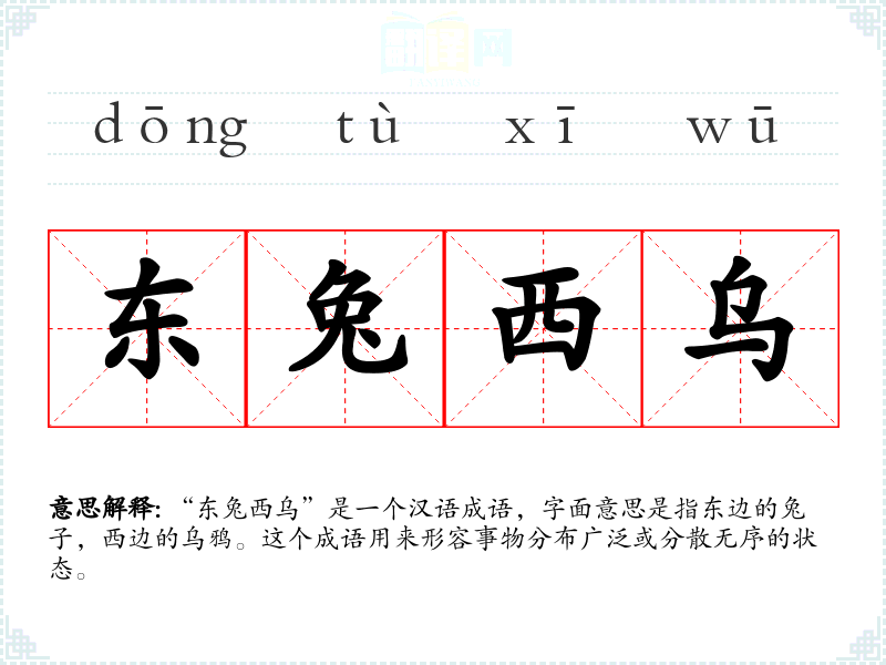 “东兔西乌”是一个汉语成语,字面意思是指东边的兔子,西边的乌鸦。这个成语用来形容事物分布广泛或分散无序的状态。