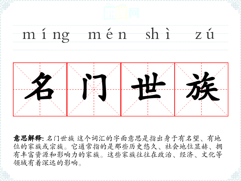 名门世族 这个词汇的字面意思是指出身于有名望、有地位的家族或宗族。它通常指的是那些历史悠久、社会地位显赫、拥有丰富资源和影响力的家族。这些家族往往在政治、经济、文化等领域有着深远的影响。