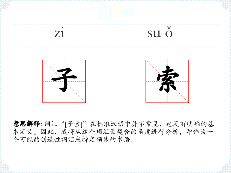 如果“[子索]”是一个特定领域的术语,它可能在科技、法律、医学等领域中有特定的含义。在文学或口语中,它可能被用作一个象征性的词汇,表达某种特定的概念或情感。