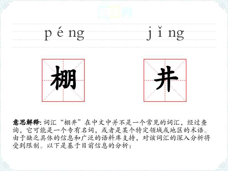 由于“棚井”不是一个常见的词汇,对其的理解和分析受到限制。在语言学习和表达中,了解词汇的具体含义和使用场景是非常重要的。对于不明确的词汇,需要更多的上下文信息和语料库支持来进行深入分析。