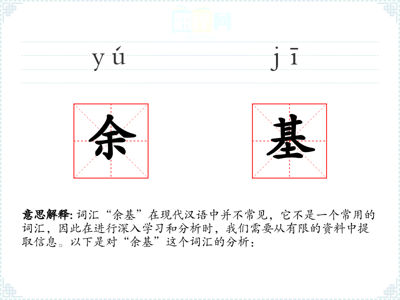 词汇“余基”在现代汉语中并不常见,它不是一个常用的词汇,因此在进行深入学习和分析时,我们需要从有限的资料中提取信息。以下是对“余基”这个词汇的分析: