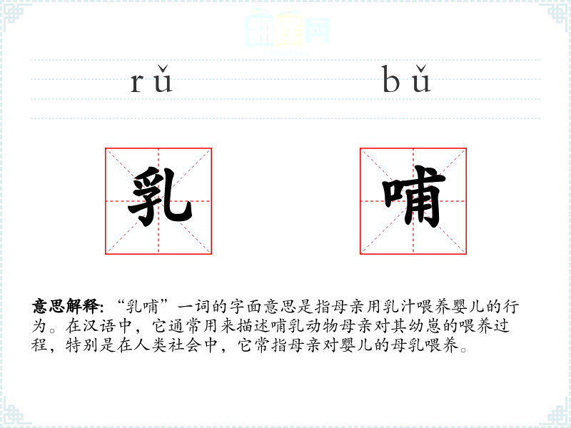 “乳哺”一词在汉语中历史悠久,其构成由“乳”(指乳房或乳汁)和“哺”(指喂养)组成。在古代文献中,如《诗经》、《礼记》中已有使用,反映了母乳喂养在传统文化中的重要性。