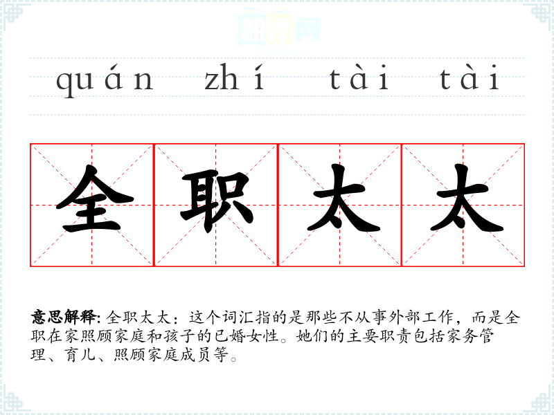 全职太太:这个词汇指的是那些不从事外部工作,而是全职在家照顾家庭和孩子的已婚女性。她们的主要职责包括家务管理、育儿、照顾家庭成员等。