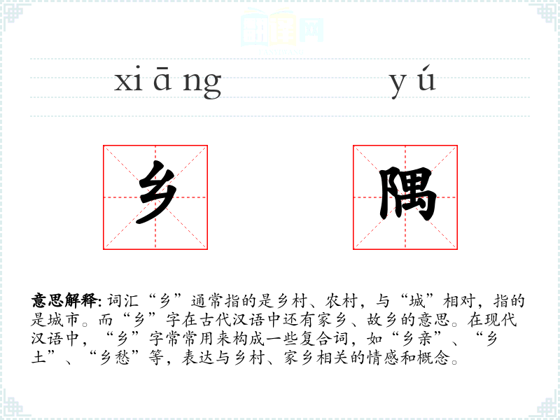 词汇“乡”通常指的是乡村、农村,与“城”相对,指的是城市。而“乡”字在古代汉语中还有家乡、故乡的意思。在现代汉语中,“乡”字常常用来构成一些复合词,如“乡亲”、“乡土”、“乡愁”等,表达与乡村、家乡相关的情感和概念。