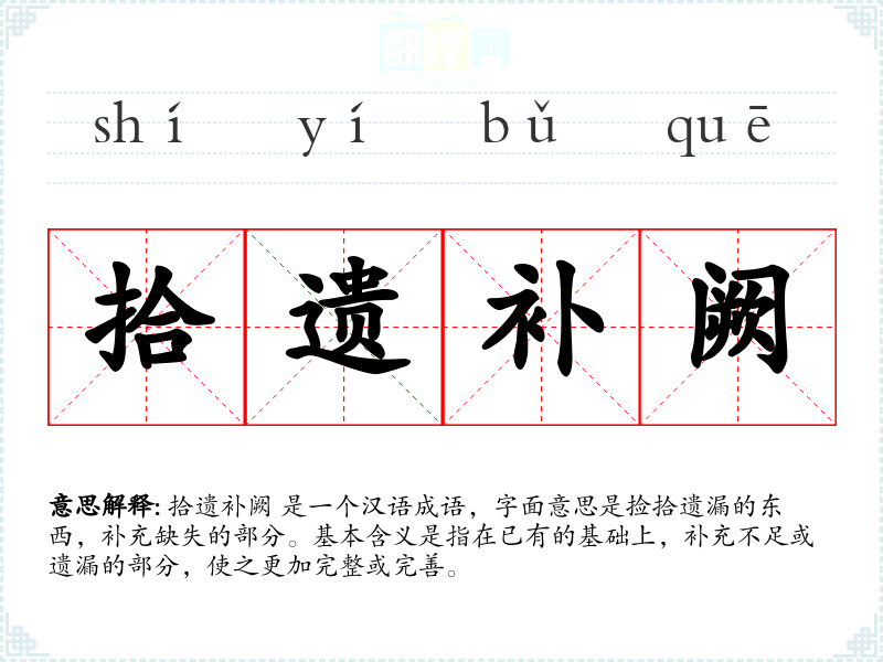 拾遗补阙 是一个汉语成语,字面意思是捡拾遗漏的东西,补充缺失的部分。基本含义是指在已有的基础上,补充不足或遗漏的部分,使之更加完整或完善。