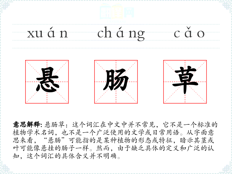 由于“悬肠草”不是一个标准词汇,它在不同语言或文化中的对应词汇及其使用情况也难以比较。如果它在某个特定的文化或语言中被使用,那么它的意义和使用情况可能与那个文化或语言的特定背景和传统相关。