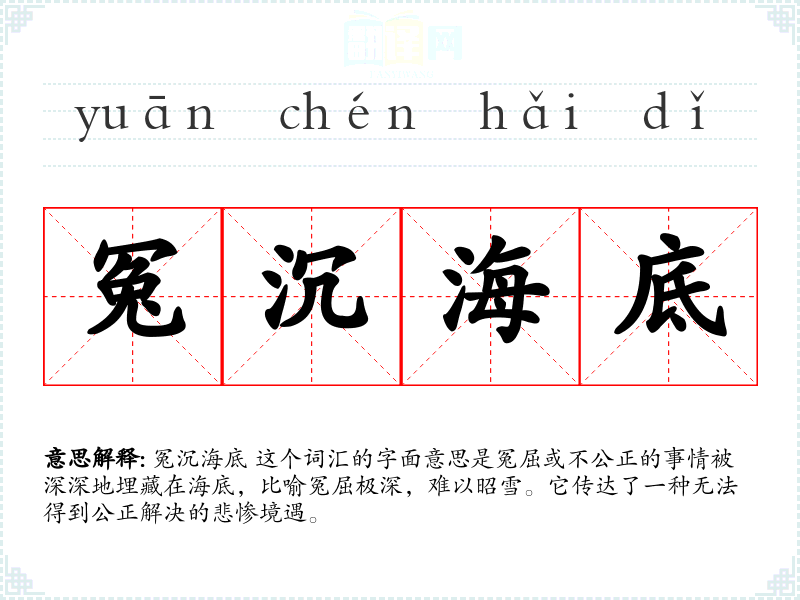 冤沉海底 这个词汇的字面意思是冤屈或不公正的事情被深深地埋藏在海底,比喻冤屈极深,难以昭雪。它传达了一种无法得到公正解决的悲惨境遇。