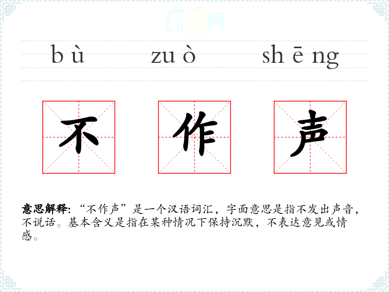 “不作声”是一个汉语词汇,字面意思是指不发出声音,不说话。基本含义是指在某种情况下保持沉默,不表达意见或情感。