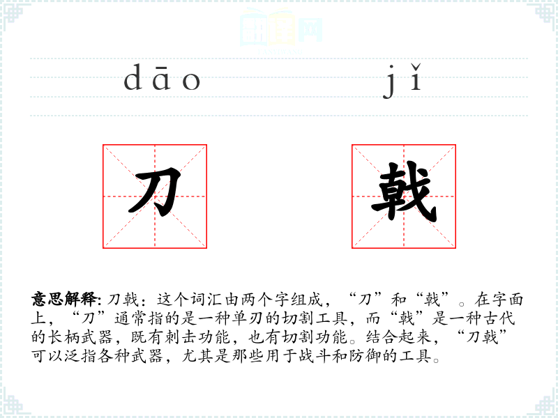 刀戟:这个词汇由两个字组成,“刀”和“戟”。在字面上,“刀”通常指的是一种单刃的切割工具,而“戟”是一种古代的长柄武器,既有刺击功能,也有切割功能。结合起来,“刀戟”可以泛指各种武器,尤其是那些用于战斗和防御的工具。