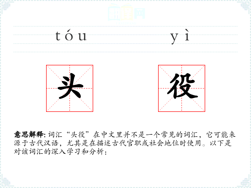 词汇“头役”在中文里并不是一个常见的词汇,它可能来源于古代汉语,尤其是在描述古代官职或社会地位时使用。以下是对该词汇的深入学*和分析: