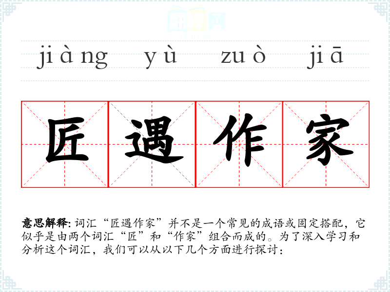 词汇“匠遇作家”并不是一个常见的成语或固定搭配,它似乎是由两个词汇“匠”和“作家”组合而成的。为了深入学*和分析这个词汇,我们可以从以下几个方面进行探讨: