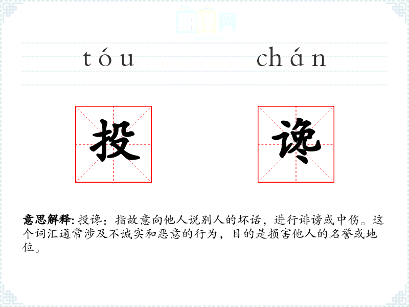 投谗:指故意向他人说别人的坏话,进行诽谤或中伤。这个词汇通常涉及不诚实和恶意的行为,目的是损害他人的名誉或地位。