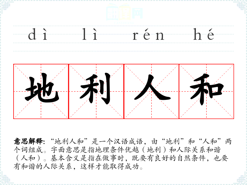 “地利人和”是一个汉语成语,由“地利”和“人和”两个词组成。字面意思是指地理条件优越(地利)和人际关系和谐(人和)。基本含义是指在做事时,既要有良好的自然条件,也要有和谐的人际关系,这样才能取得成功。