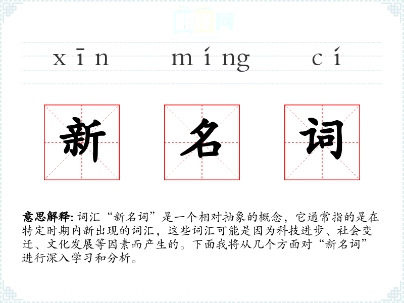 “新名词”字面意思是指新出现的词汇或术语。它们通常用来描述新事物、新概念或新现象,是语言适应社会发展的一种表现。