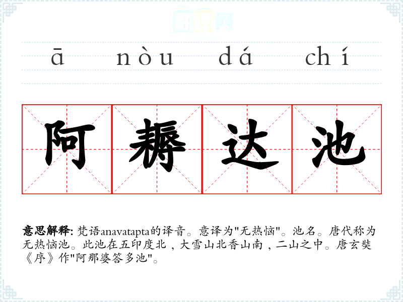 梵语anavatapta的译音。意译为"无热恼"。池名。唐代称为无热恼池。此池在五印度北﹐大雪山北香山南﹐二山之中。唐玄奘《序》作"阿那婆答多池"。