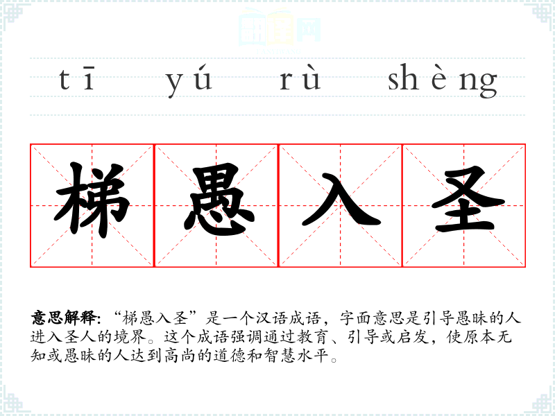 “梯愚入圣”是一个汉语成语,字面意思是引导愚昧的人进入圣人的境界。这个成语强调通过教育、引导或启发,使原本无知或愚昧的人达到高尚的道德和智慧水平。