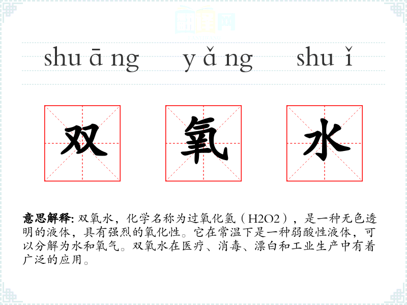 - 口语:在日常口语中,双氧水通常指用于消毒或清洁的化学品。