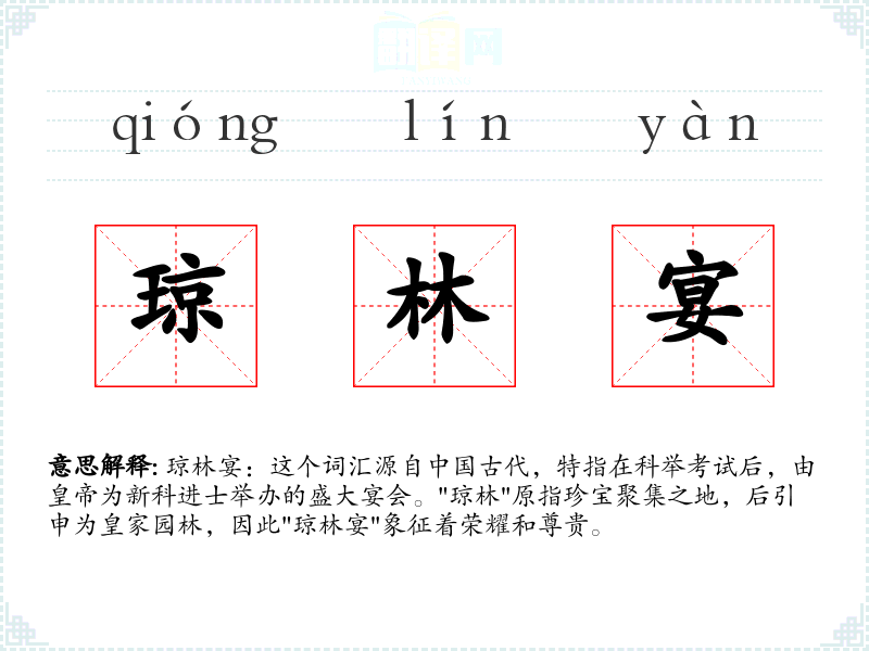 琼林宴:这个词汇源自古代,特指在科举考试后,由为新科进士举办的盛大宴会。"琼林"原指珍宝聚集之地,后引申为皇家园林,因此"琼林宴"象征着荣耀和尊贵。