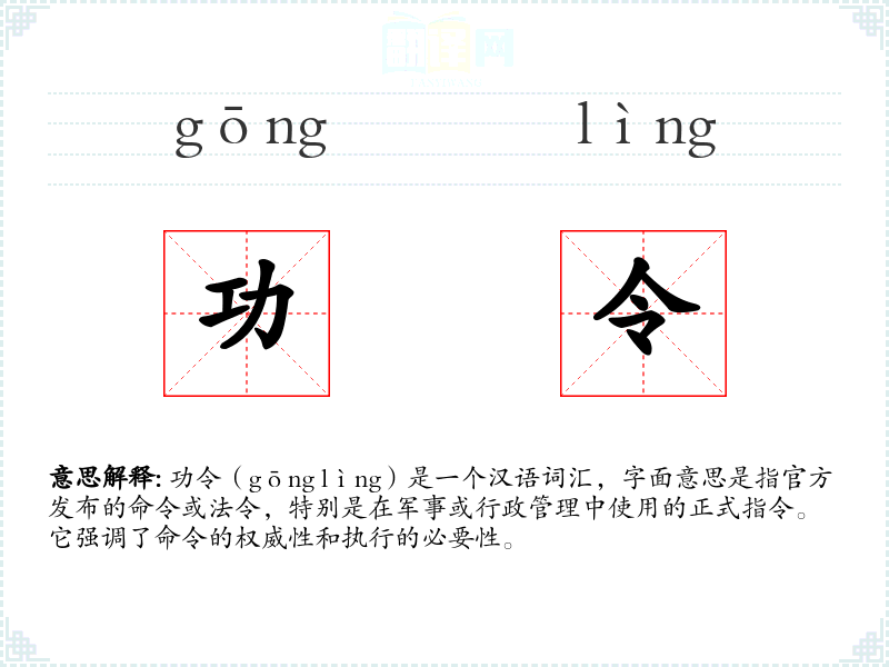 功令(gōng lìng)是一个汉语词汇,字面意思是指官方发布的命令或法令,特别是在军事或行政管理中使用的正式指令。它强调了命令的权威性和执行的必要性。