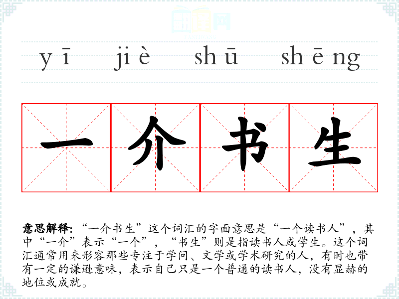 “一介书生”这个词汇的字面意思是“一个读书人”,其中“一介”表示“一个”,“书生”则是指读书人或学生。这个词汇通常用来形容那些专注于学问、文学或学术研究的人,有时也带有一定的谦逊意味,表示自己只是一个普通的读书人,没有显赫的地位或成就。