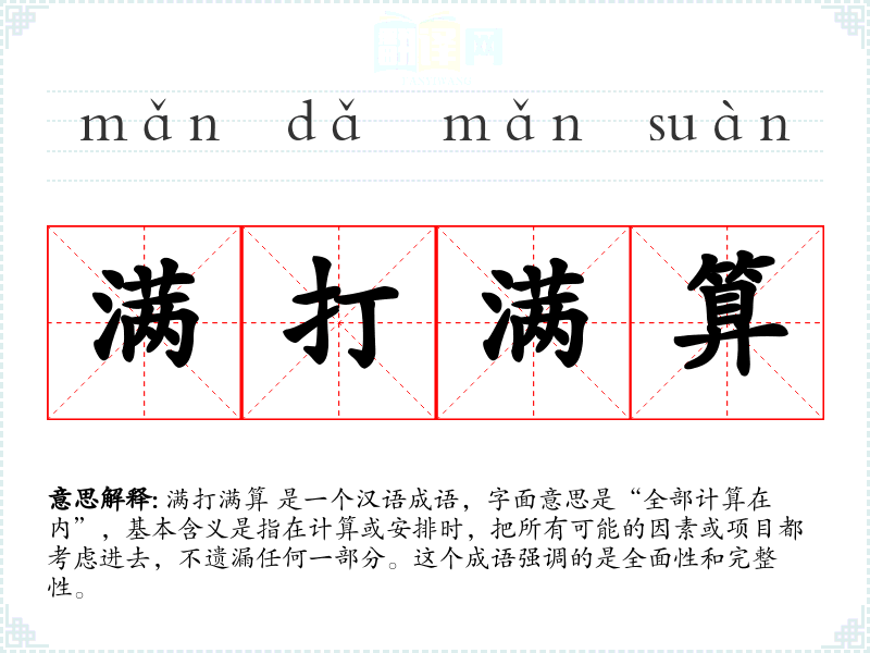满打满算 是一个汉语成语,字面意思是“全部计算在内”,基本含义是指在计算或安排时,把所有可能的因素或项目都考虑进去,不遗漏任何一部分。这个成语强调的是全面性和完整性。