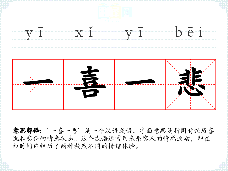 “一喜一悲”是一个汉语成语,字面意思是指同时经历喜悦和悲伤的情感状态。这个成语通常用来形容人的情感波动,即在短时间内经历了两种截然不同的情绪体验。