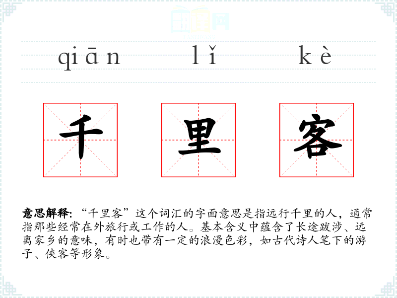 “千里客”这个词汇的词源较为直接,由“千里”和“客”两个词组成。在古代汉语中,“千里”常用来形容距离的遥远,“客”则指客人或旅行者。随着时间的推移,这个词汇的含义基本保持不变,但在不同的文学作品和社会语境中,其内涵和外延有所扩展。