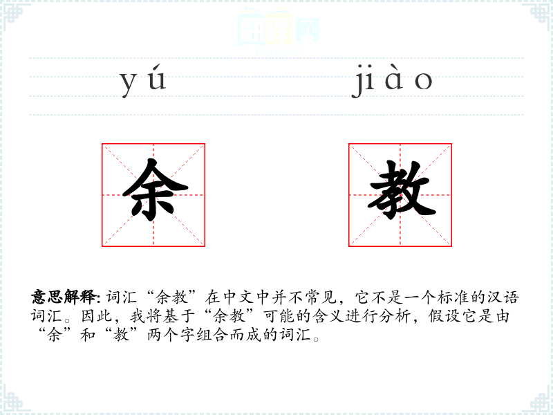 词汇“余教”在中文中并不常见,它不是一个标准的汉语词汇。因此,我将基于“余教”可能的含义进行分析,假设它是由“余”和“教”两个字组合而成的词汇。