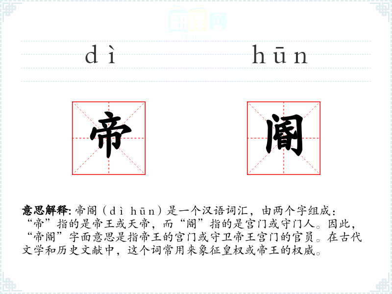 帝阍(dì hūn)是一个汉语词汇,由两个字组成:“帝”指的是帝王或天帝,而“阍”指的是宫门或守门人。因此,“帝阍”字面意思是指帝王的宫门或守卫帝王宫门的官员。在古代文学和历史文献中,这个词常用来象征皇权或帝王的权威。