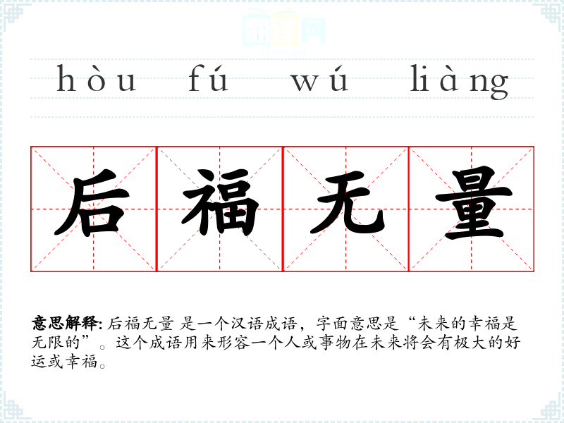 后福无量 是一个汉语成语,字面意思是“未来的幸福是无限的”。这个成语用来形容一个人或事物在未来将会有极大的好运或幸福。