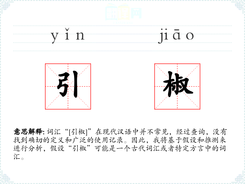 词汇“[引椒]”在现代汉语中并不常见,经过查询,没有找到确切的定义和广泛的使用记录。因此,我将基于假设和推测来进行分析,假设“引椒”可能是一个古代词汇或者特定方言中的词汇。