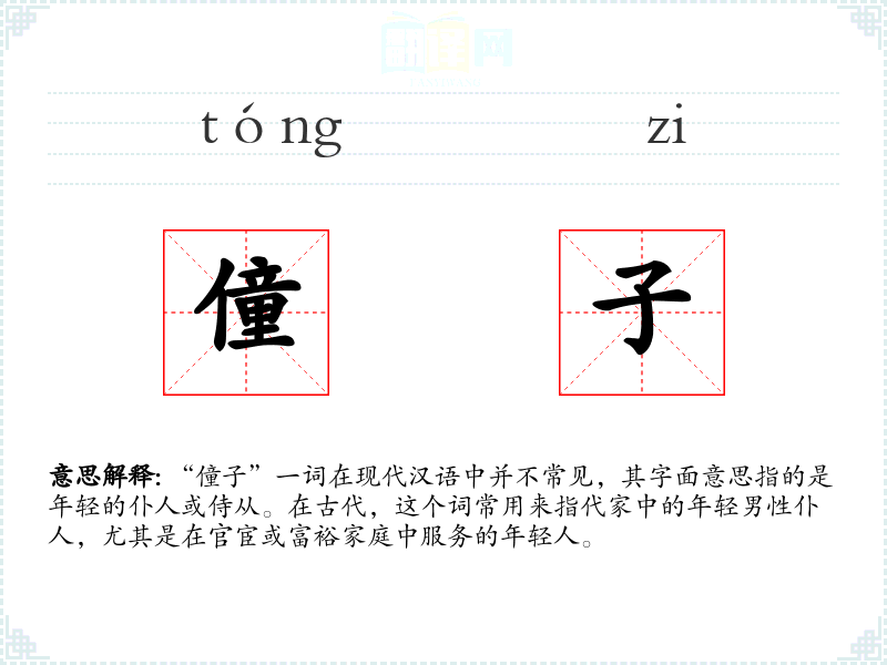 “僮子”一词在现代汉语中并不常见,其字面意思指的是年轻的仆人或侍从。在古代,这个词常用来指代家中的年轻男性仆人,尤其是在官宦或富裕家庭中服务的年轻人。