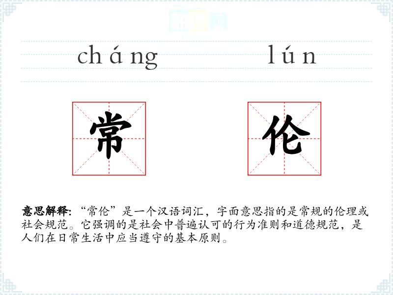 “常伦”是一个汉语词汇,字面意思指的是常规的伦理或社会规范。它强调的是社会中普遍认可的行为准则和道德规范,是人们在日常生活中应当遵守的基本原则。