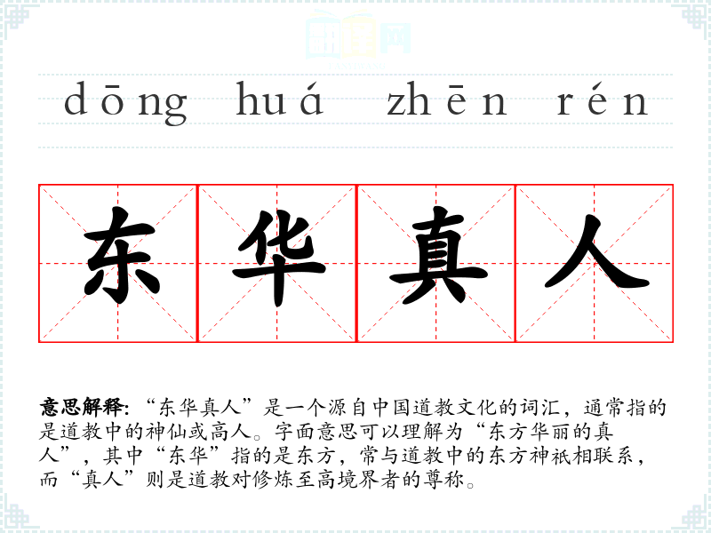 “东华真人”是一个源自**道教文化的词汇,通常指的是道教中的神仙或高人。字面意思可以理解为“东方华丽的真人”,其中“东华”指的是东方,常与道教中的东方神祇相联系,而“真人”则是道教对修炼至高境界者的尊称。