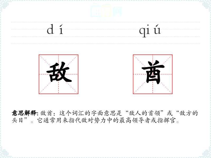 敌酋:这个词汇的字面意思是“敌人的首领”或“敌方的头目”。它通常用来指代敌对势力中的最高领导者或指挥官。