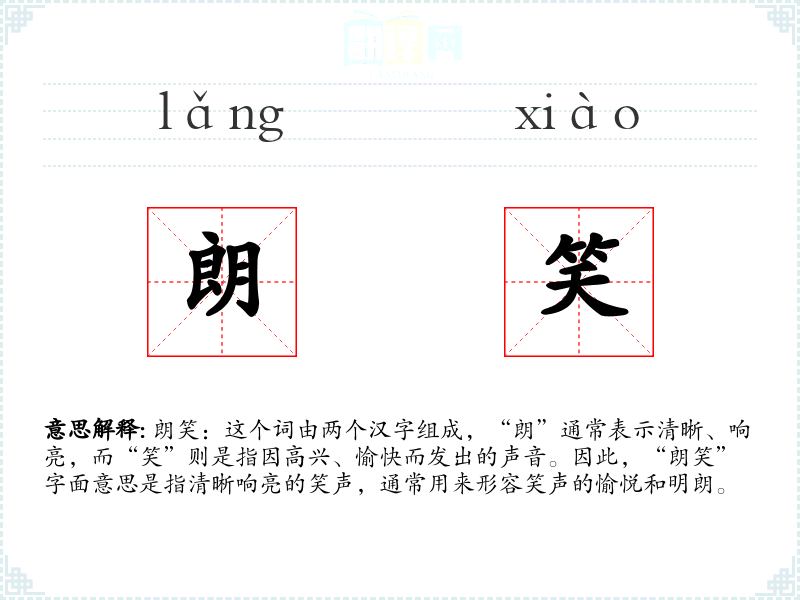 朗笑:这个词由两个汉字组成,“朗”通常表示清晰、响亮,而“笑”则是指因高兴、愉快而发出的声音。因此,“朗笑”字面意思是指清晰响亮的笑声,通常用来形容笑声的愉悦和明朗。